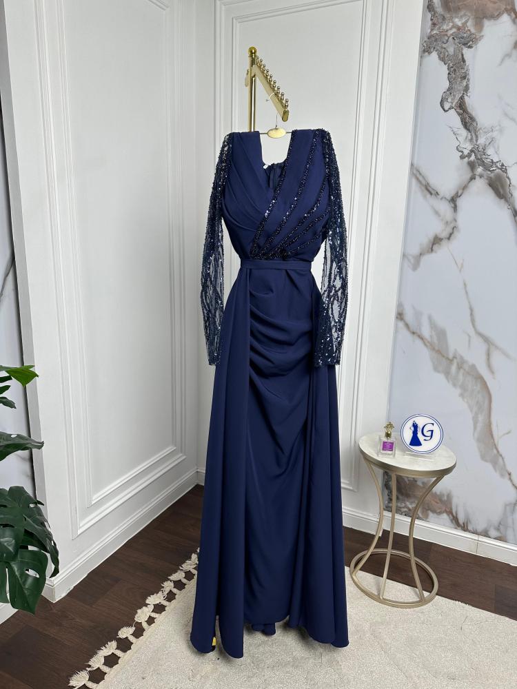 فستان سهرة لون كحلي تركي مزين مع ذيل خلفي